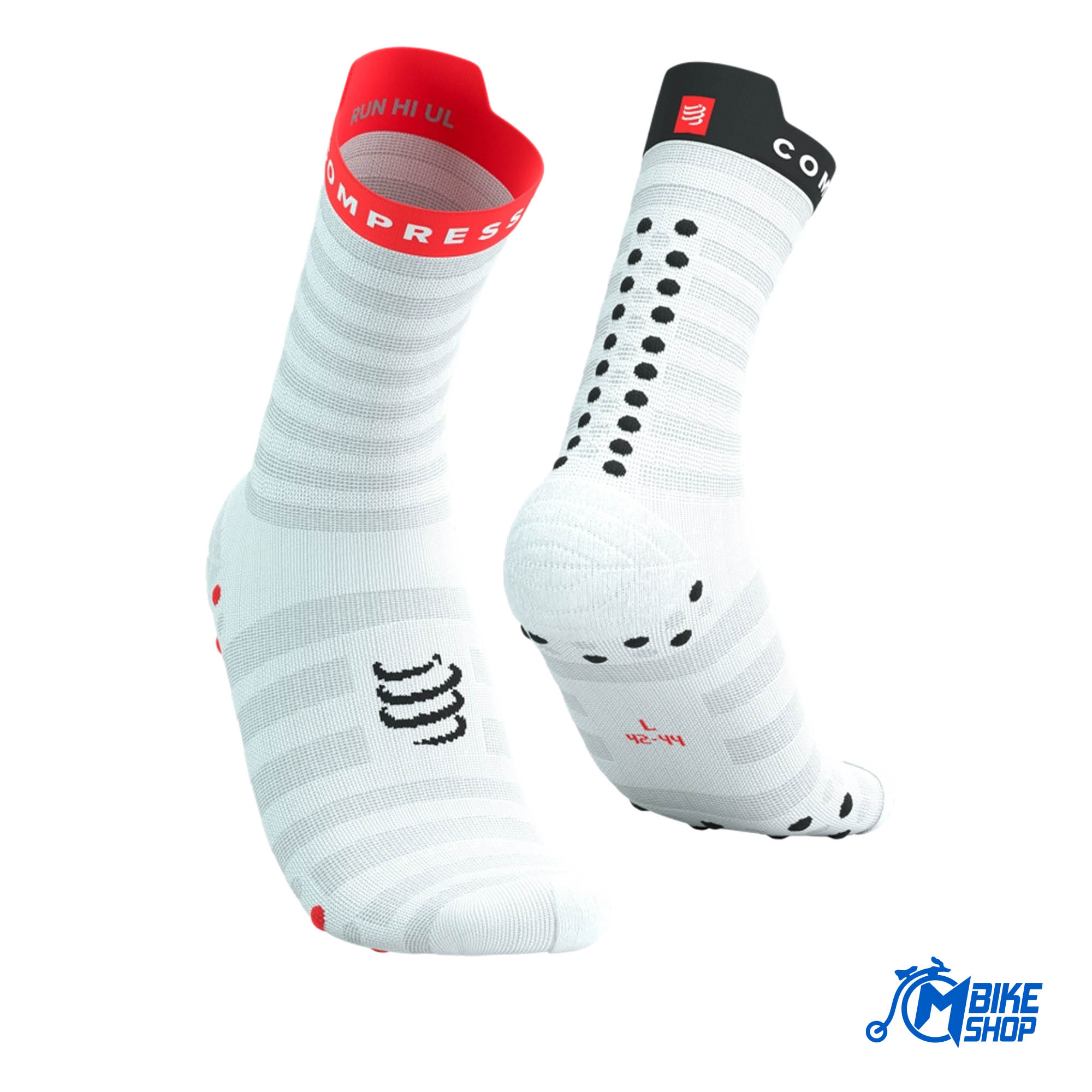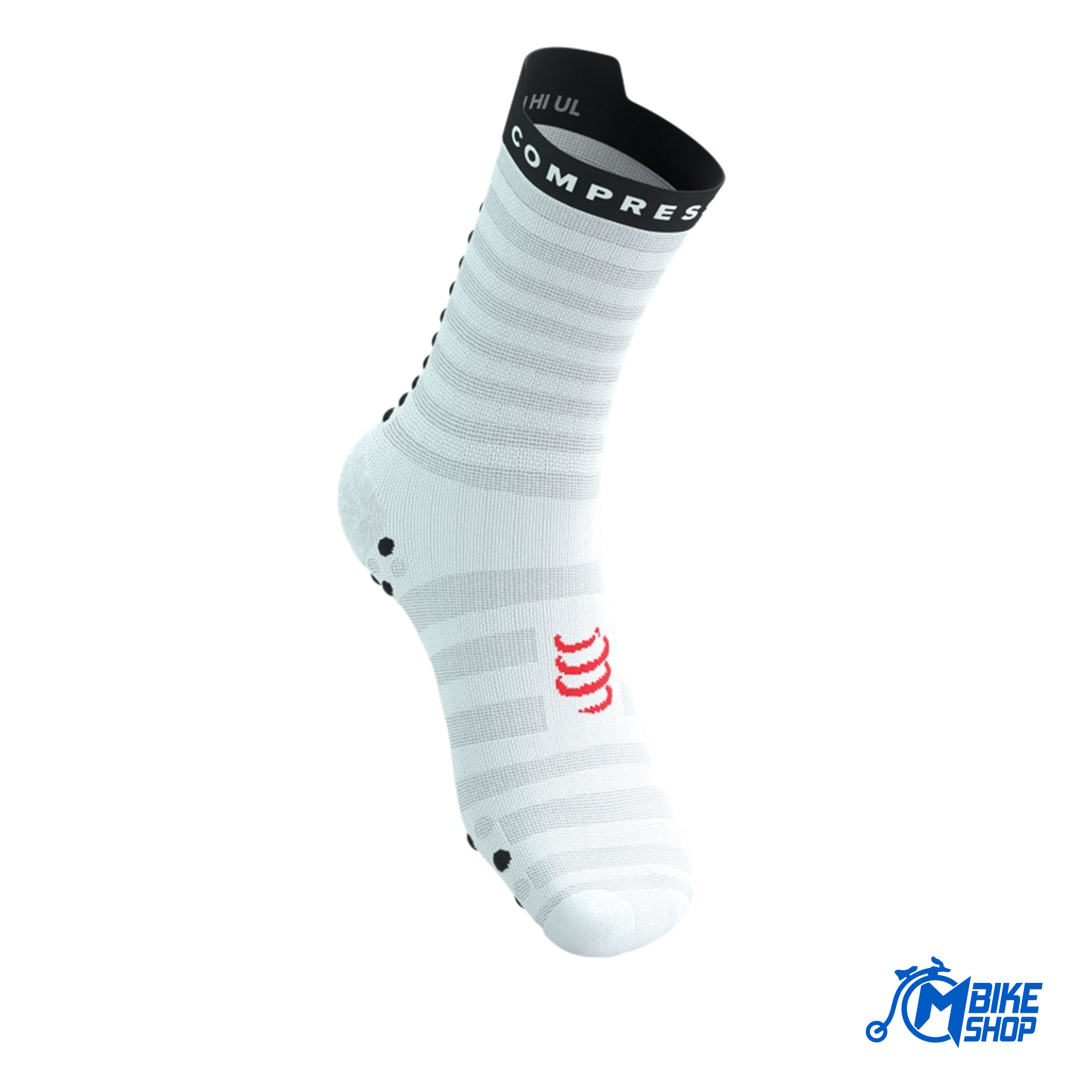 Lagana tehnička mreža dizajnirana je da pristaje kao druga koža. Nudi iznimnu ventilaciju i brzo odvodi znoj tako da vaša stopala ostaju svježa i suha, čak i u tropskim klimatskim uslovima. Šira kutija za nožne prste nudi ergonomsko pristajanje i poboljšanu propriocepciju, dopuštajući nožnim prstima intuitivno širenje pri doskoku za prirodan, tečan korak. Posebno pletivo oko zgloba, lakše od Compressport klasičnih čarapa za trčanje, nudi nježnu potporu dok ubrzavate tempo. Karakteristična potpora za luk sprječava uvijanje i iritaciju tkanine na vrućini, dok vas ojačanje od frotira oko palca štiti od pocrnjelih noktiju dok se kilometri nakupljaju. Recite zbogom žuljevima! Prepoznatljive 3D.Dots i nove Flat.Dots na ovom ultralakom modelu štede na volumenu i težini, ali još uvijek pružaju prednosti visokih performansi. Dužinom Ahilove tetive nude dodatnu zaštitu i ventilaciju tokom brzih utrka. Pod nogama, pametan uzorak koji se sastoji od 50% 3D.Dots i 50% Mesh.Dots ublažava udarce i dodaje prianjanje u cipeli.